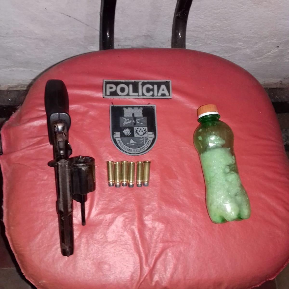 Logo depois, os policiais resolveram fazer uma varredura no local e encontraram um revólver Taurus, calibre 38, com 6 munições, celular e um tubo contendo cola de sapato.