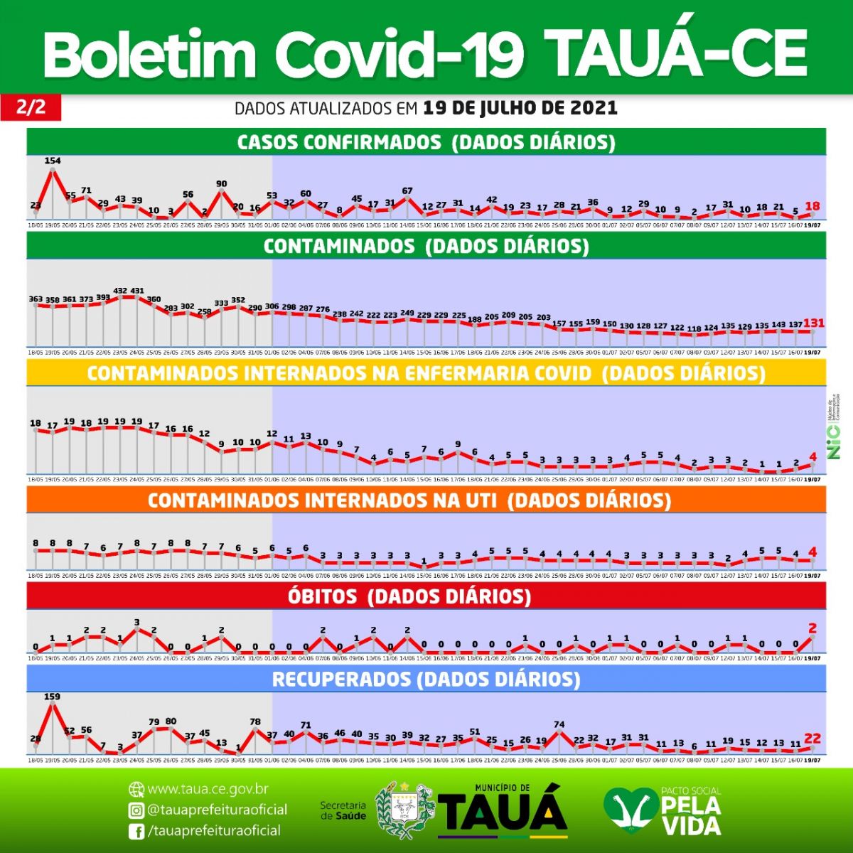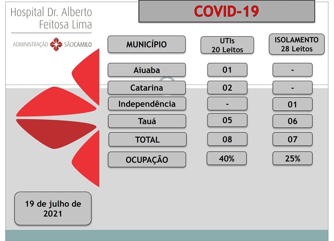 A taxa de ocupação de leitos de UTI-Covid no Hospital Dr. Alberto Feitosa Lima permanece em 45%, segundo o boletim divulgado na tarde de hoje(19). Dos 8 leitos ocupados, 5 são de pacientes de Tauá.