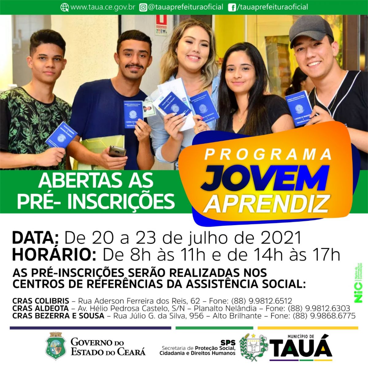 A Prefeitura Municipal de Tauá, por meio da Secretaria de Proteção Social, Direitos Humanos e Cidadania (SPS), em parceria com o Programa Primeiro Passo do Governo do Estado do Ceará, abriu hoje(20), pré-inscrições para o preenchimento de 25 vagas de estágio e qualificação profissional por um período de 11 meses.