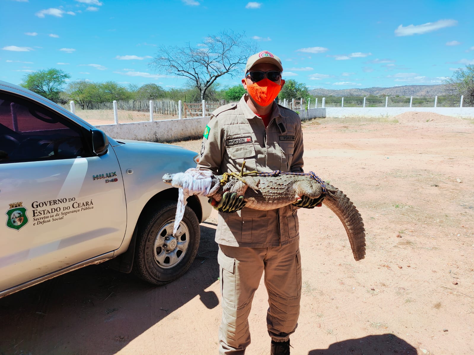 Um jacaretinga ( Caiman crocodilus), réptil carnívoro, foi resgatado na manhã deste sábado (24), por uma equipe do Corpo de Bombeiros Militar do Estado do Ceará, na zona rural do Município de Independência.