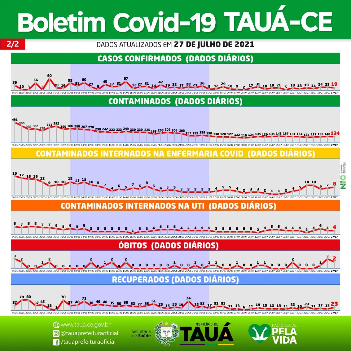 Mais dois óbitos por Covid-19 foram contabilizados pela Secretaria de Saúde do Município de Tauá por meio do Boletim Epidemiológico divulgado na noite de hoje(27), elevando para 178, o número de mortes pela doença. Um dos óbitos estava em investigação.