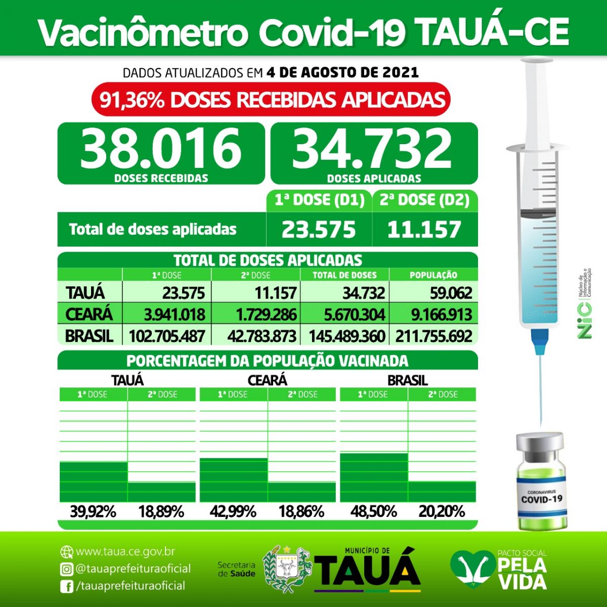 O Município de Tauá aplicou 91,36% das doses de vacinas recebidas durante a campanha contra a Covid-19, segundo o Vacinômetro divulgado na noite de hoje(04), pela Secretaria de Saúde.