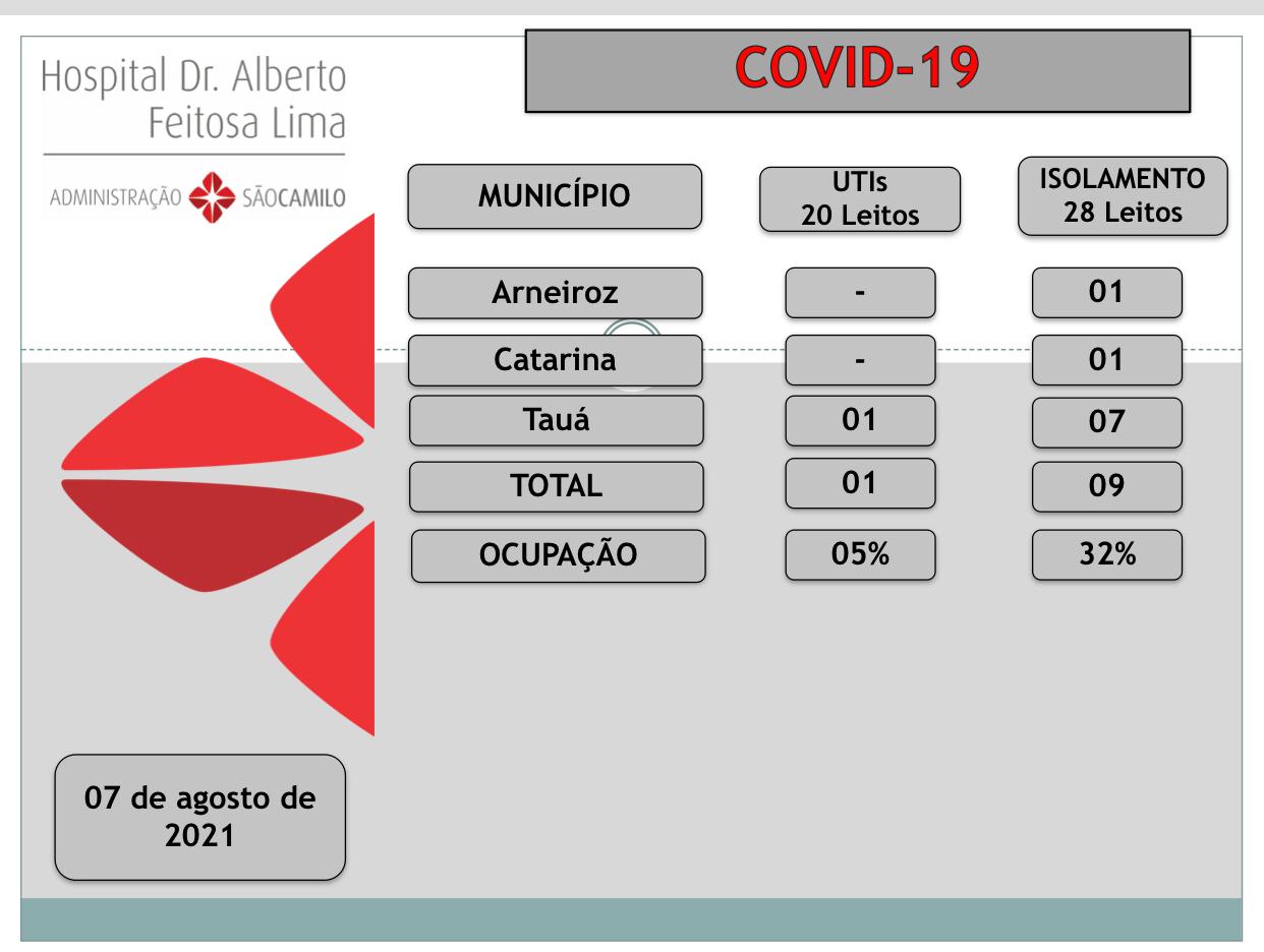 A taxa de ocupação de leitos de UTI-Covid no Hospital Dr. Alberto Feitosa Lima, voltou a cair na tarde de hoje(07). Segundo o Boletim Hospitalar, apenas um paciente de Tauá está internado.