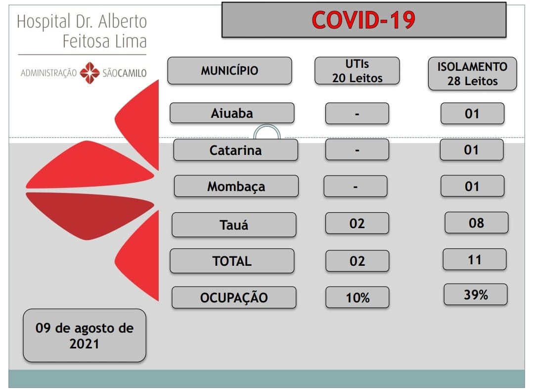 A taxa de ocupação de leitos de UTI-Covid no Hospital de Tauá permanece em 10%, com apenas dois pacientes de Tauá internados. Dos 20 leitos, 18 estão desocupados.