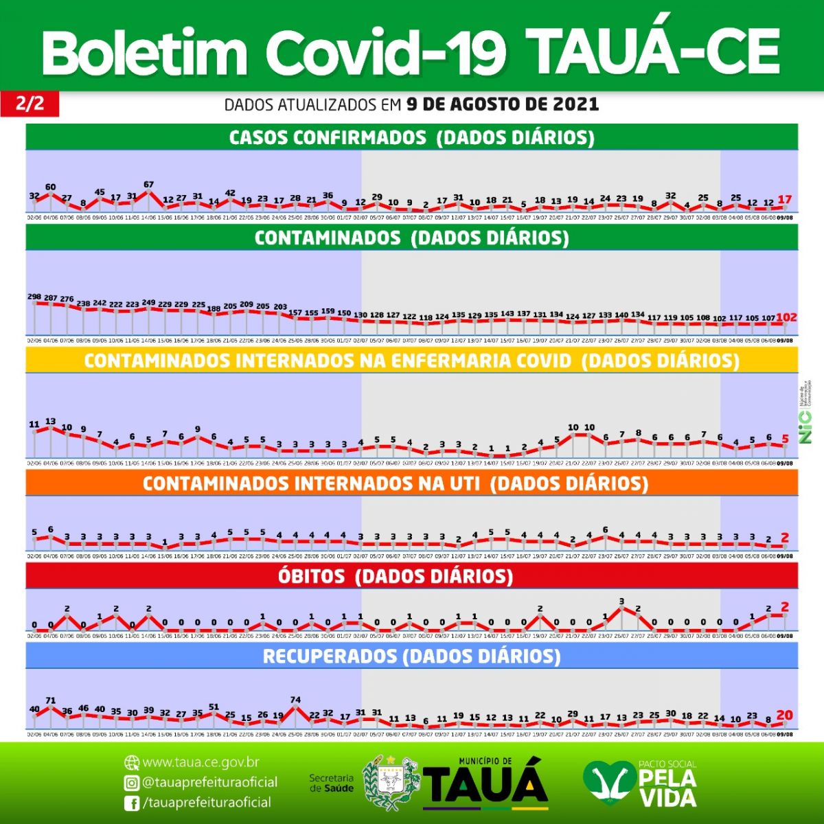 O Município de Tauá contabilizou mais duas mortes provocadas pelo Coronavírus no Boletim Epidemiológico divulgado hoje(09), elevando para 183, os óbitos desde o início da pandemia, um deles, registrado anteriormente teve a confirmação da causa nesta segunda-feira.