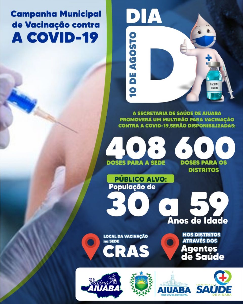 Na Sede, a imunização está sendo realizada no CRAS e na zona rural, por meio dos Agentes Comunitários de Saúde.