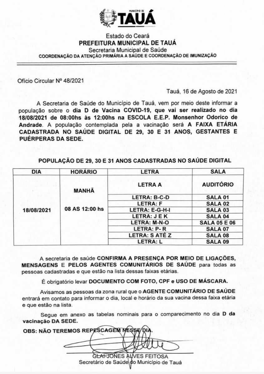 As pessoas da cidade serão vacinadas na Escola Profissional Monsenhor Odorico de Andrade, no horário de 8h às 12h. Já as que residem na zona rural devem aguardar o contato telefônico a ser feito pelos Agentes de Saúde.