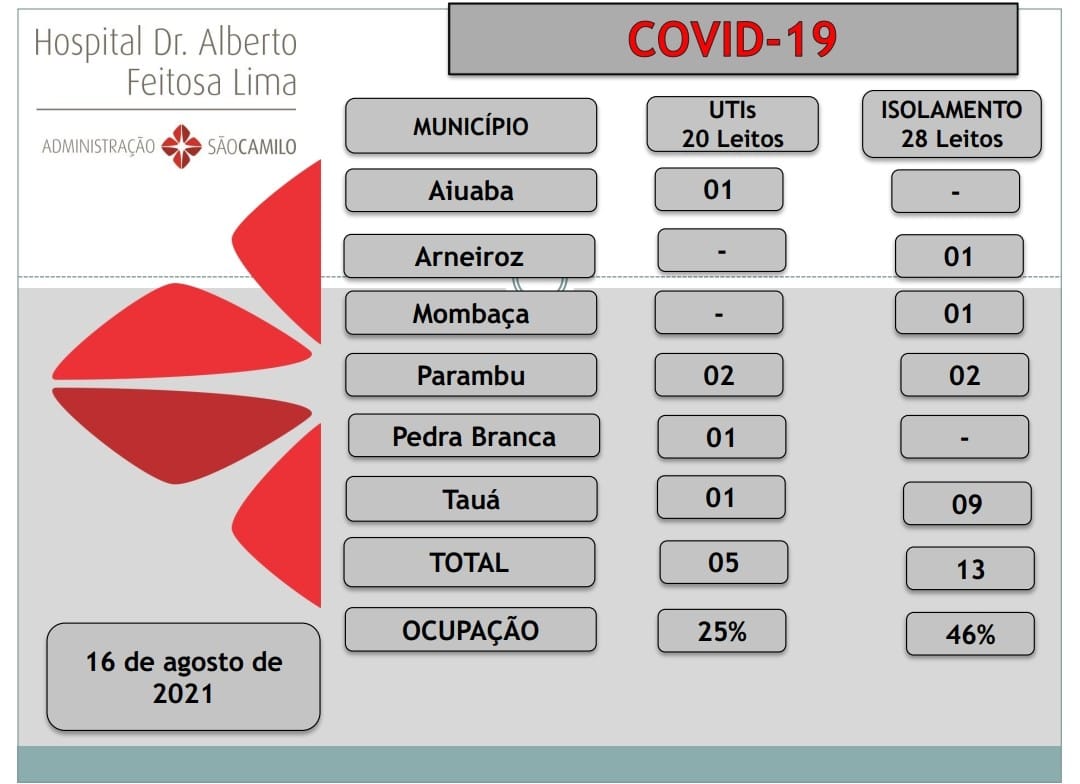 A taxa de ocupação de leitos de UTI-Covid no Hospital Dr. Alberto Feitosa Lima teve redução nesta segunda-feira(16) e agora está com 25%. Apenas um paciente de Tauá está internado.