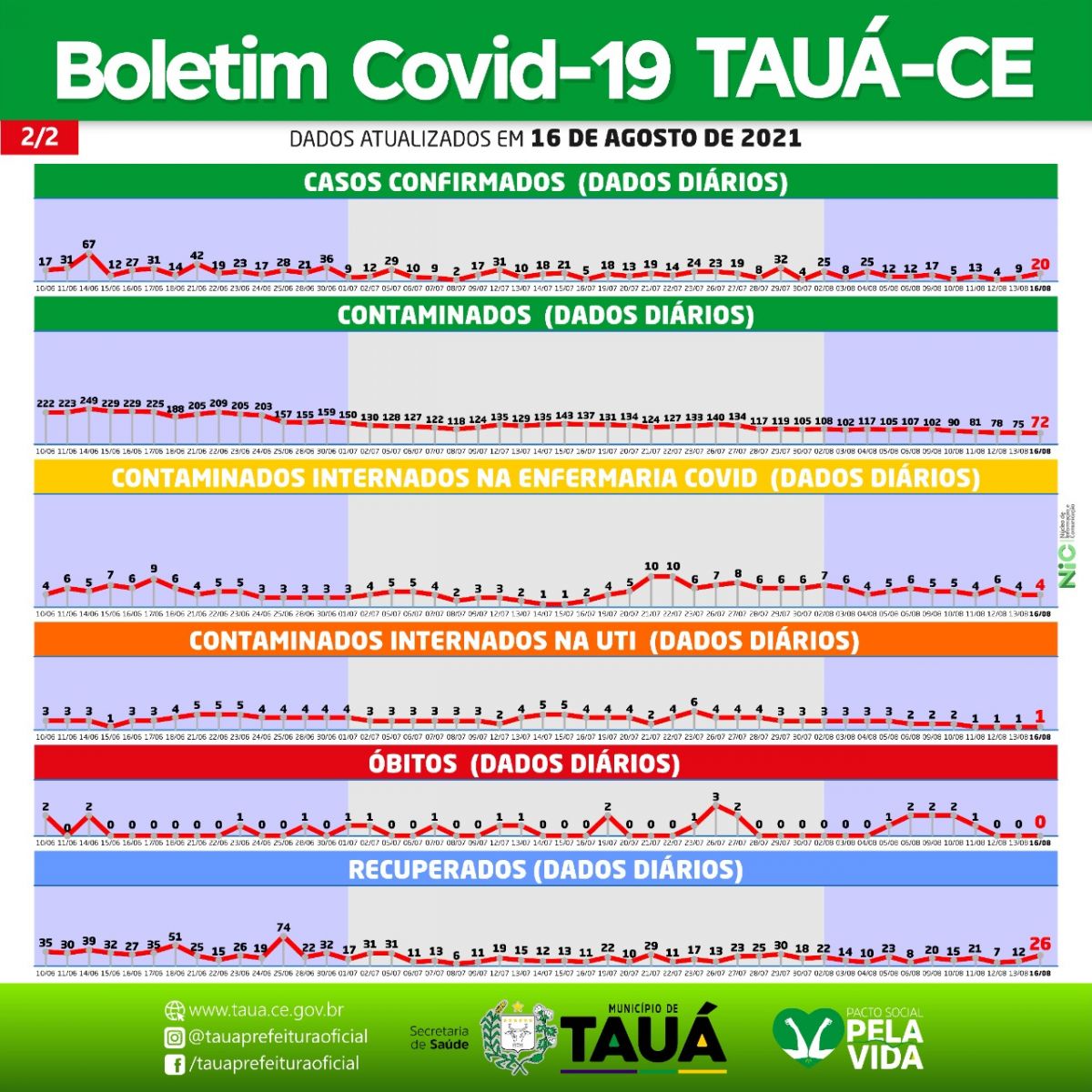A tendência de queda do número de novos casos de Covid-19 no Município de Tauá se mantém em queda nesse início de semana. O Boletim Epidemiológico divulgado na noite de ontem(16), mostra que atualmente 72 pessoas estão infectadas, sendo 67 em isolamento domiciliar e 05 hospitalizadas.