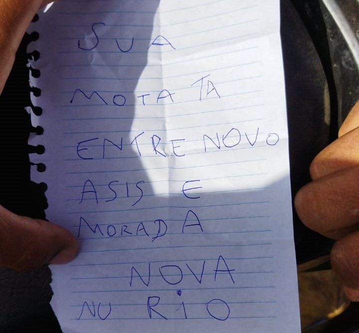Equipes da Polícia Militar e Guarda Municipal foram acionadas e encontraram a moto no local informado no bilhete.