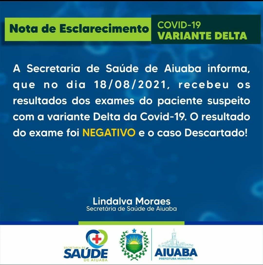 Foi descartado o caso suspeito de Variante Delta no Município de Aiuaba que estava sendo investigado pelas Secretarias de Saúde do Estado e Município.