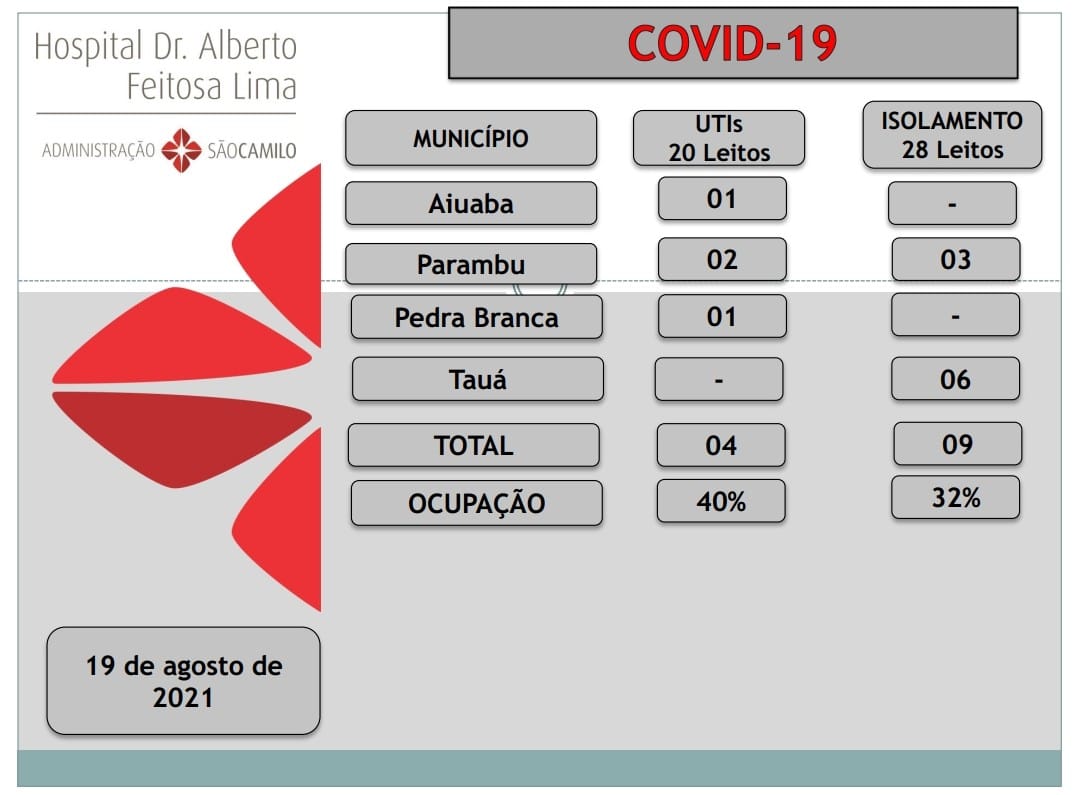A taxa de ocupação de leitos de UTI-Covid no Hospital Dr. Alberto Feitosa Lima, saltou de 15% para 40%, num intervalo de 24h. São 4 pacientes internados, mas nenhum de Tauá.