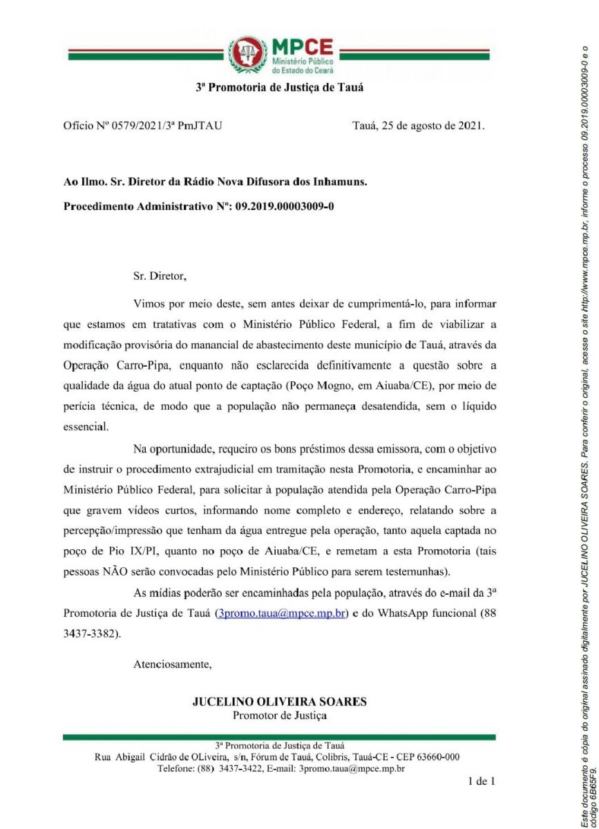 Por meio de Ofício encaminhado à Rádio Difusora dos Inhamuns, o representante do Ministério Público do Estado do Ceará está pedindo o apoio das famílias prejudicadas com a paralisação da Operação Pipa do Exército, para que gravem e enviem vídeos curtos, informando o nome e endereço completo, relatando sobre a qualidade da água captada do poço Mogno, em Aiuaba, e do anterior, no Município de Pio IX, no Estado do Piauí e distribuidas nas comunidades. O MP tranquiliza que as pessoas não serão convocadas para serem testemunhas.