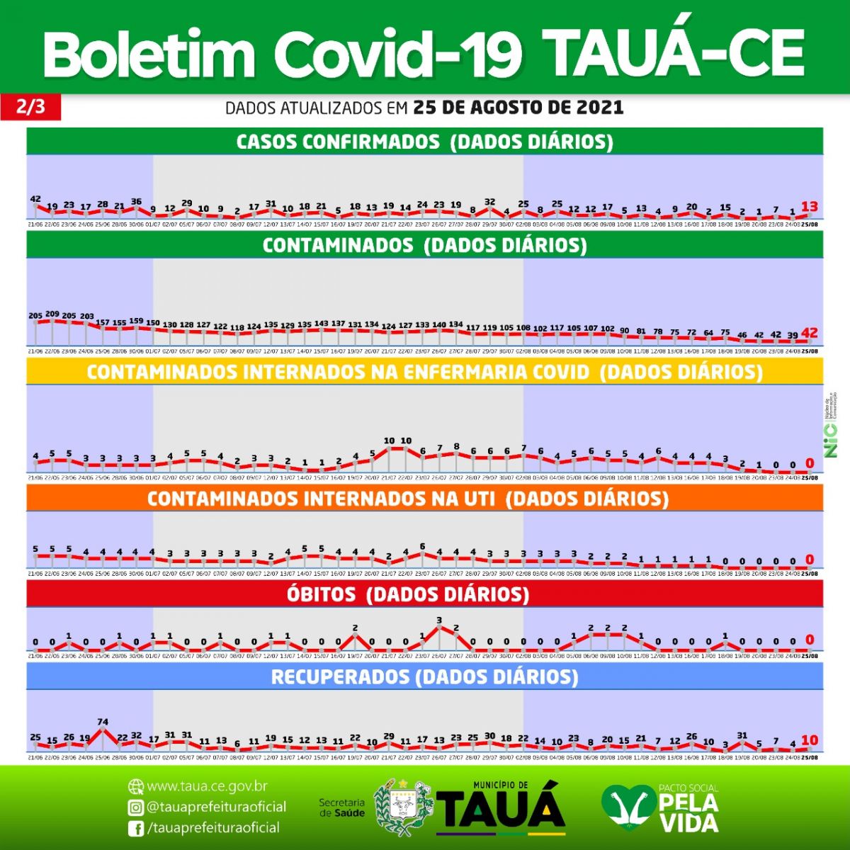 Permanecem estáveis os números da pandemia da Covid-19 e a taxa de ocupação de leitos de UTI no Municipio de Tauá, segundo os boletins divulgados ontem(25).
