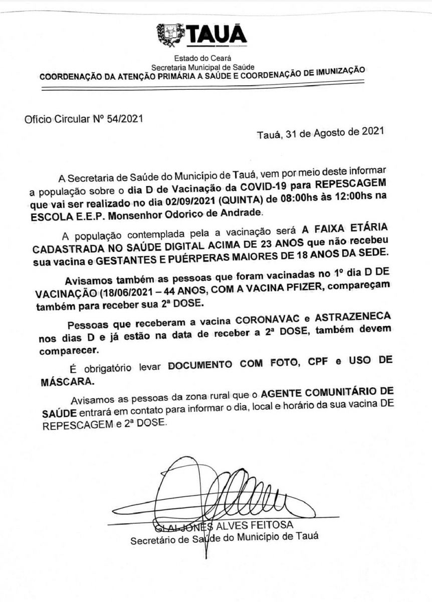 A Secretaria de Saúde do município de Tauá realizará nesta quinta-feira(02), mais um Dia D de vacinação contra a Covid para atender o público acima de 23 anos de idade que ainda não se vacinou(repescagem) devidamente cadastrado na Plataforma Saúde Digital e aplicação da segunda dose para quem recebeu a primeira e está no prazo. Também serão vacinadas as gestantes e puérperas a partir dos 18 anos.