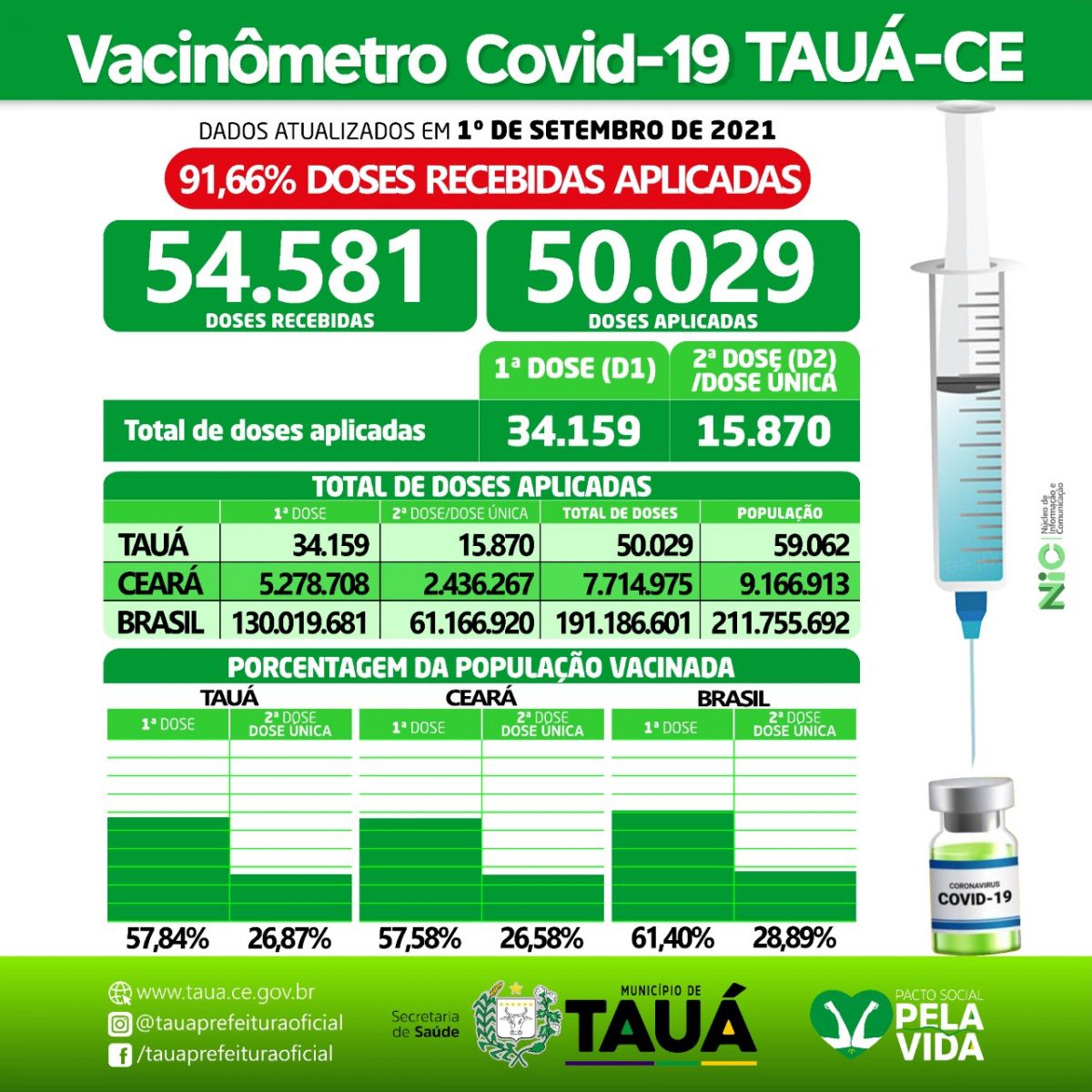 Mais de 50 mil doses de vacinas contra a Covid foram aplicadas no município de Tauá. O vacinômetro foi divulgado na manhã de hoje(01), pela Secretaria de Saúde.