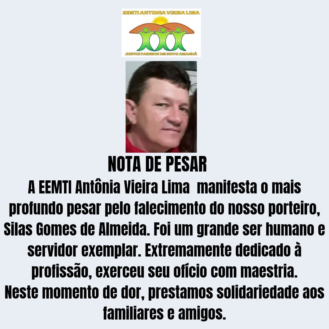 A direção da Escola Antônia Vieira Lima divulgou nota de pesar lamentando a morte do servidor.