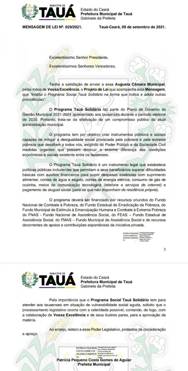 "O Programa Tauá Solidário tem com público alvo as famílias que se encontram em situação de vulnerabilidade e risco social agudo, e preencham os requisitos de comprovação do estado de pobreza e de extrema pobreza", finalizou a Prefeita de Tauá.