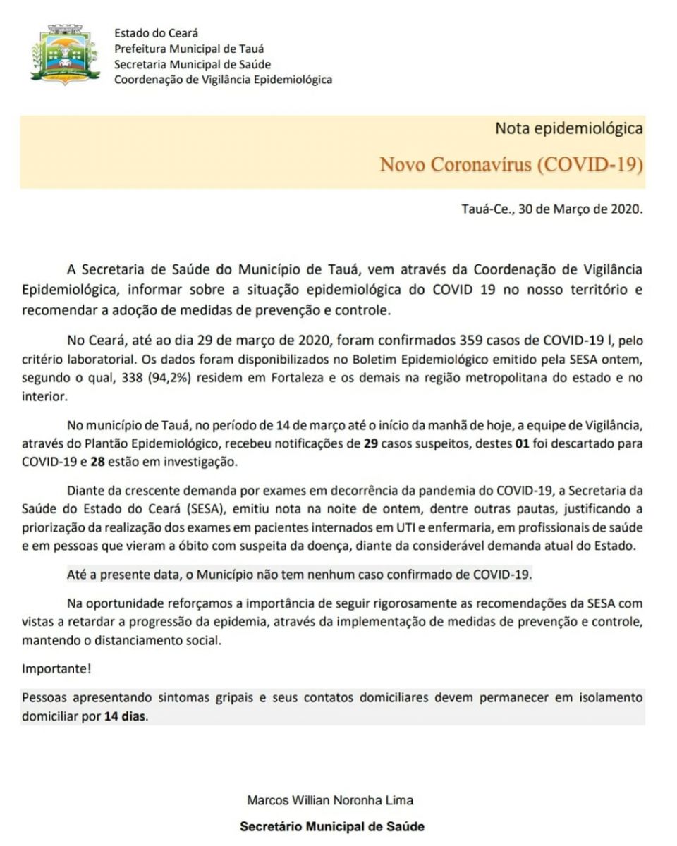 O número de casos suspeitos de coronavírus no município de Tauá subiu para 29, segundo Nota Epidemiológica divulgada pela Secretaria de Saúde nesta segunda-feira(30). No último boletim, divulgado dia 27, os casos suspeitos eram 21 e mais um caso descartado.