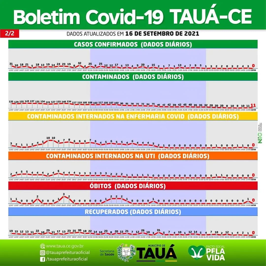 O município de Tauá não registrou nenhum novo caso de Covid nas últimas 24h. O Boletim Epidemiológico divulgado ontem(16), informa ainda que também ninguém se recuperou da doença no mesmo período.