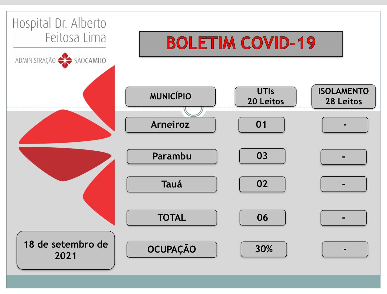 Dos 20 leitos de UTI-Covid disponíveis no Hospital, 06 estão ocupados. Os pacientes são de Parambu(03), Tauá(02) e Arneiroz(01).