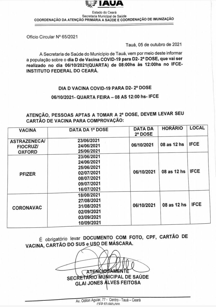 A Secretaria de Saúde de Tauá realiza nesta quarta-feira(06), mais um Dia D de vacinação contra a Covid-19. Dessa vez, serão imunizadas somente as pessoas que tomaram a 1ª dose dos 3 tipos de vacinas disponíveis, AstraZeneca, Pfizer e Coronavac, entre os meses de junho, julho e agosto.