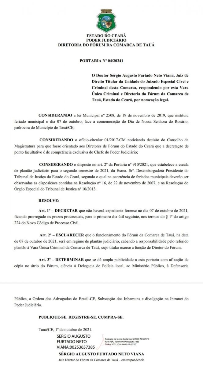 O Juiz Dr. Sérgio Augusto Furtado Neto Viana baixou Portaria decretando que não haverá expediente forense nesta quinta-feira(07).