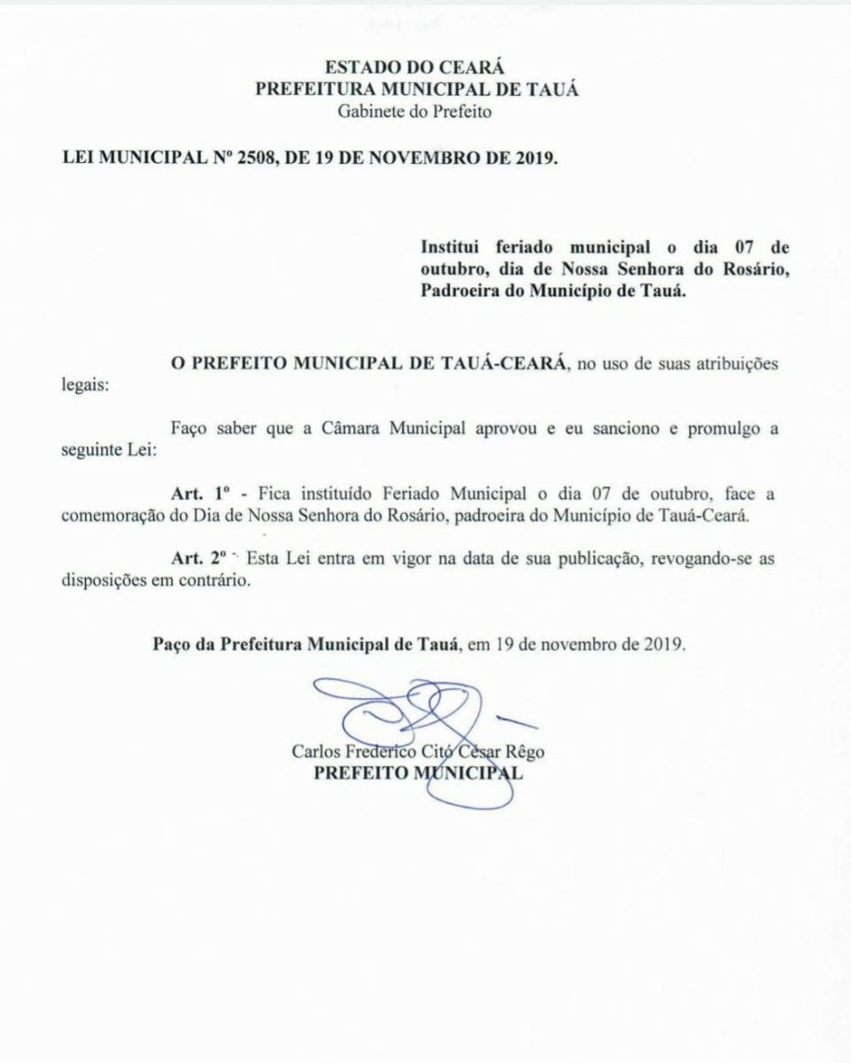 O Feriado Municipal está determinado pela Lei Municipal aprovada pela Câmara Municipal e publicada pela Prefeitura de Tauá em 2019, na gestão do ex-prefeito Fred Rêgo.