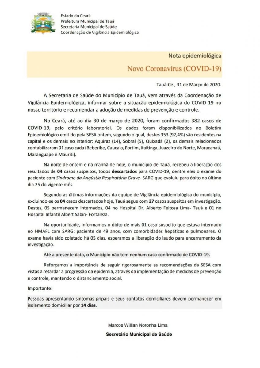 A Secretaria de Saúde do município de Tauá divulgou Nota Epidemiológica no início da tarde desta terça-feira(31), contendo os resultados dos primeiros exames de pacientes considerados suspeitos de COVID-19.