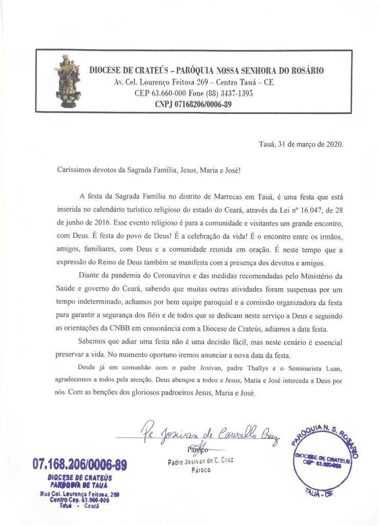 A Paróquia de Nossa Senhora do Rosário e a Comissão Organizadora da tradicional festa religiosa de Jesus, Maria e José, realizada na vila de Marrecas, zona rural de Tauá, foi adiada pela primeira vez em sua história, devido a pandemia do coronavírus.