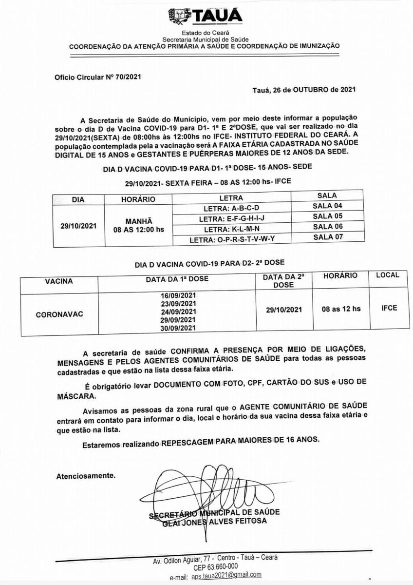 A Secretaria de Saúde do município de Tauá anuncia a realização de mais um Dia D de vacinação contra a Covid-19, para a faixa etária de 15 anos(cidade e distritos), aplicação de D2 para quem tomou CoronaVac e repescagem para adolescentes maiores de 16 anos.