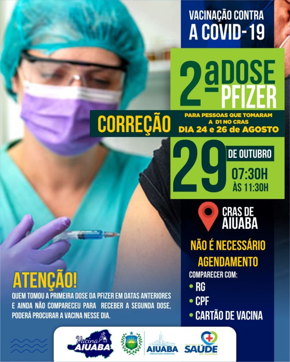 A Secretaria de Saúde do município de Aiuaba realizará na sexta-feira(29), mais uma etapa de vacinação contra a Covid-19. Desse vez, serão imunizados com a segunda dose da Pfizer, as pessoas vacinadas nos dias 24 e 26 de agosto.