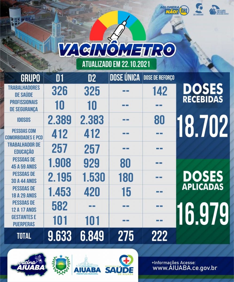 O último vacinômetro divulgado na sexta-feira(22), aponta que das 18.702 doses de vacinas contra a Covid recebidas pelo Município de Aiuaba, 16.979 foram aplicadas, sendo 9.633 de D1, 6.849 de D2, 275 de dose única e 222 doses de reforço.
