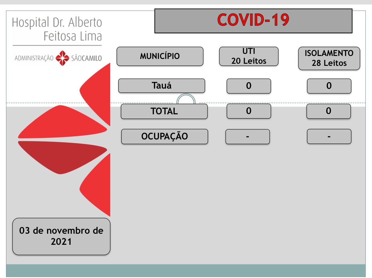Todos os 20 leitos das duas Unidades de Terapia Intensiva e os 28 da Enfermaria, estão vazios, segundo o boletim divulgado na tarde de hoje.