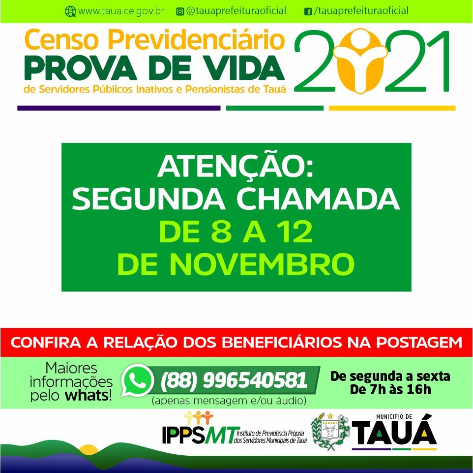 O Instituto de Previdência Própria dos Servidores Municipais de Tauá - IPPSMT anunciou hoje(08) que realizará uma segunda chamada para os aposentados e pensionistas, do Censo Previdenciário - Prova de Vida.