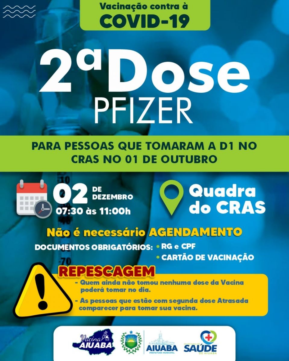 A Secretaria de Saúde de Aiuaba realiza Dia D nesta quinta-feira(02), para aplicação da segunda dose da vacina Pfizer. O atendimento será na Quadra Poliesportiva do CRAS, das 07:30h às 11h.