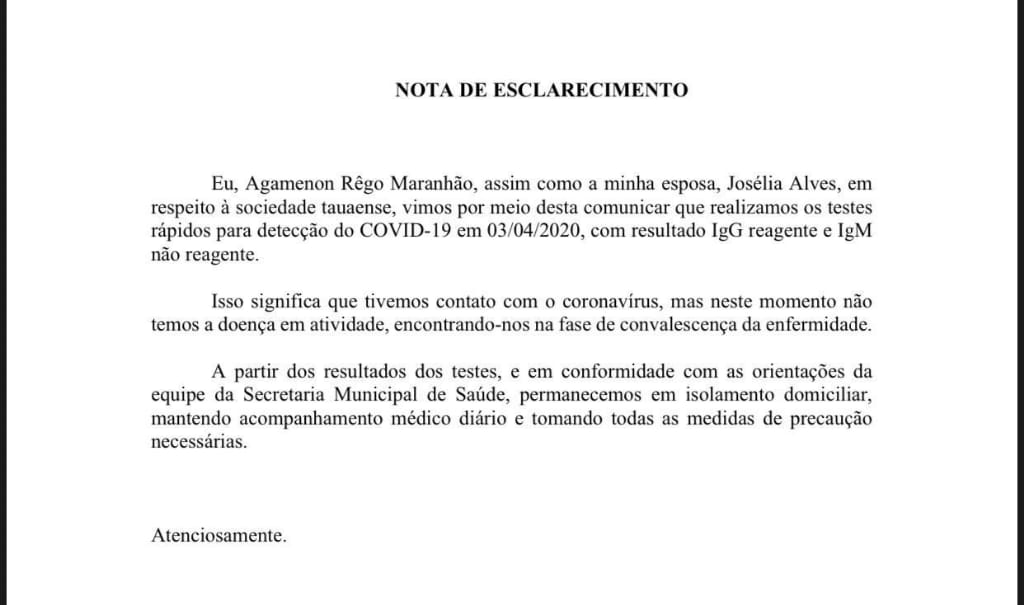 Por meio de nota divulgada na tarde deste sábado(05), o empresário Agamenon Rêgo Maranhão, divulgou nota de esclarecimento após também testar positivo para o coronavírus juntamente com sua esposa, D. Josélia Alves. Ambos também estão em isolamento domiciliar e acompanhados por profissionais de saúde.
