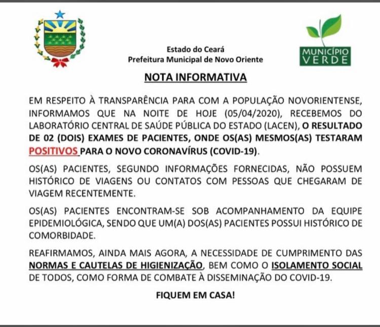 A Prefeitura de Novo Oriente confirmou na noite deste domingo(05), os primeiros dois casos positivos de coronavírus no município. O anúncio ocorreu por meio de Nota Oficial.