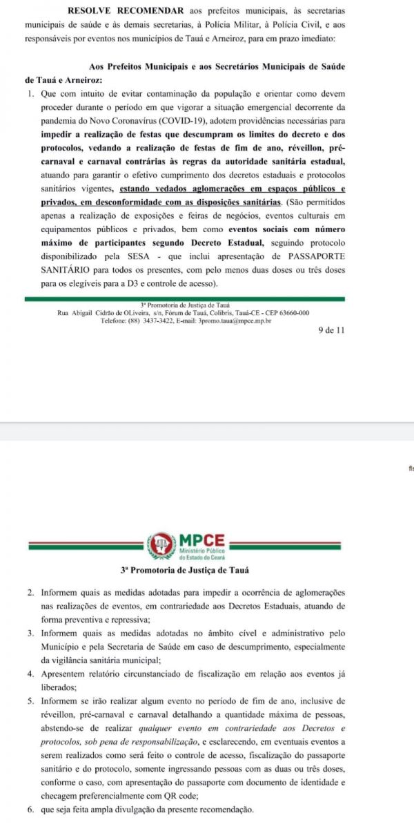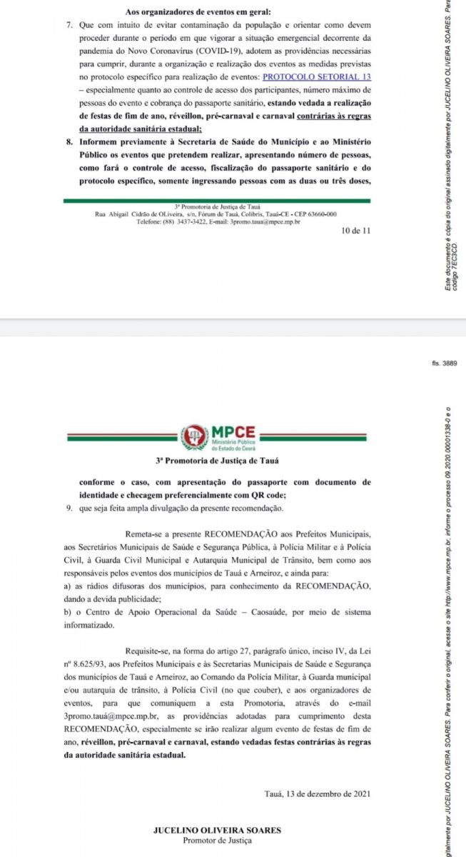 O Promotor de Justiça de Tauá e Arneiroz, Dr. Jucelino Oliveira Soares emitiu Recomendação aos gestores municipais de Tauá e Arneiroz para que adotem as providências necessárias para garantir o efetivo cumprimento dos decretos estaduais e protocolos vigentes na realização de festas no final do ano, reveillon, pré-carnaval e carnaval.