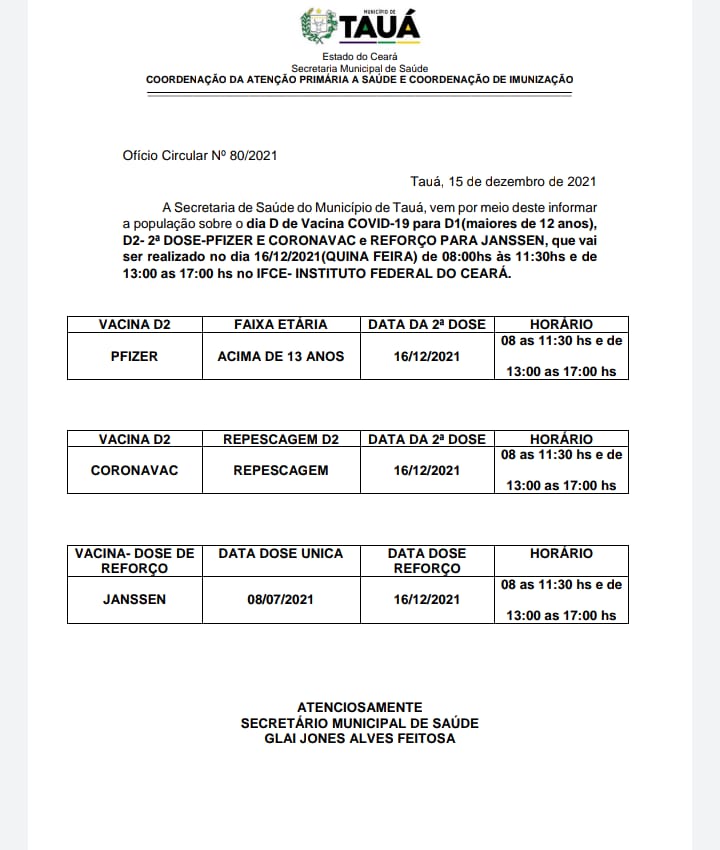 A Secretaria de Saúde do município de Tauá realiza nesta quinta-feira(16), mais uma etapa de vacinação contra a Covid, no campus do Instituto Federal, nos horários de 8h às 11:30h, e de 13h às 17h.