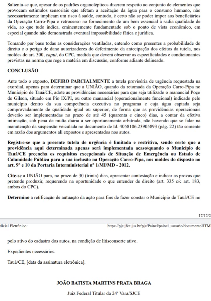 Ao deferir pacialmente a limintar o Juiz Dr. João Batista Martins Prata Braga salienta ainda que "a presente tutela de urgência é limitada e restritiva, sendo certo que a providência aqui determinada apenas será implementada acaso/quando o Município de Tauá/CE preencha os requisitos excepcionais de Situação de Emergência ou Estado de Calamidade Pública para a sua inclusão na Operação Carro-Pipa, nos moldes do disposto no art. 9° e 10 da Portaria Interministerial n° 1/MI/MD - 2012", diz trecho da decisão.