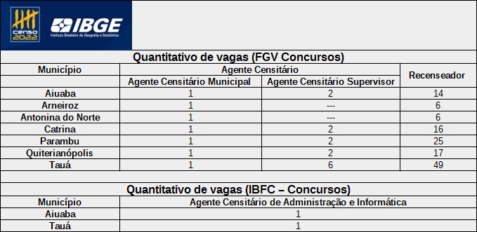 Estão sendo oferecidas 183.021 vagas para recenseadores, com remuneração variável e horário de trabalho flexível; 18.420 para agente censitário supervisor, com salário de R$ 1.700; e 5.450 para agente censitário municipal, com salário de R$ 2.100. Os agentes censitários têm carga de trabalho de 40 horas semanais.
