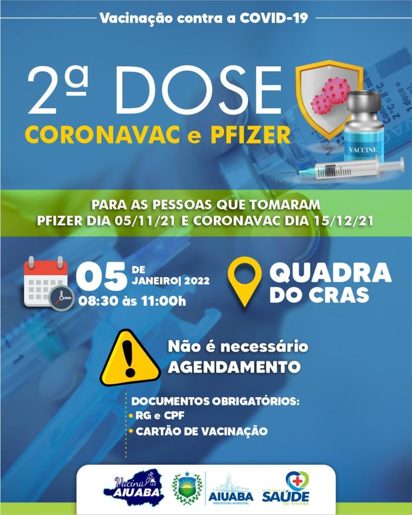 Serão disponibilizados dois tipos de vacinas, Pfizer, para que tomou a primeira dose no último dia 05 de novembro, e CoronaVac para quem tomou a D1 no dia 15 de dezembro do ano passado.