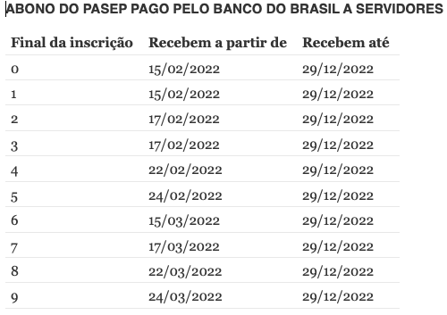 Servidores públicos No caso dos servidores públicos, os pagamentos começam em 15 de fevereiro e variam de acordo com o número final da inscrição no Pasep.