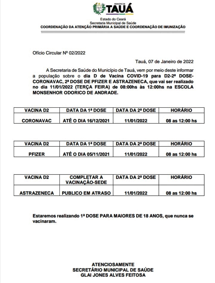 A Secretaria Municipal de Saúde realizará na terça-feira (11), mais um Dia D de vacinação contra a Covid em Tauá. Serão aplicados doses de 3 tipos de imunizantes, no horário de 8h às 12h, na Escola Profissional Monsenhor Odorico de Andrade, para as pessoas que residem na cidade.