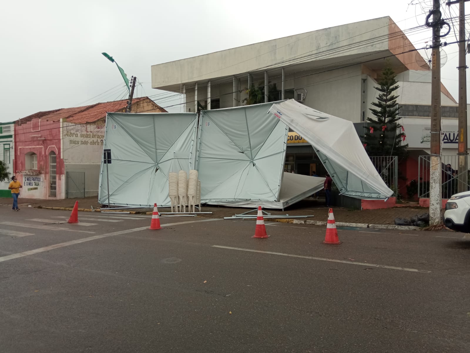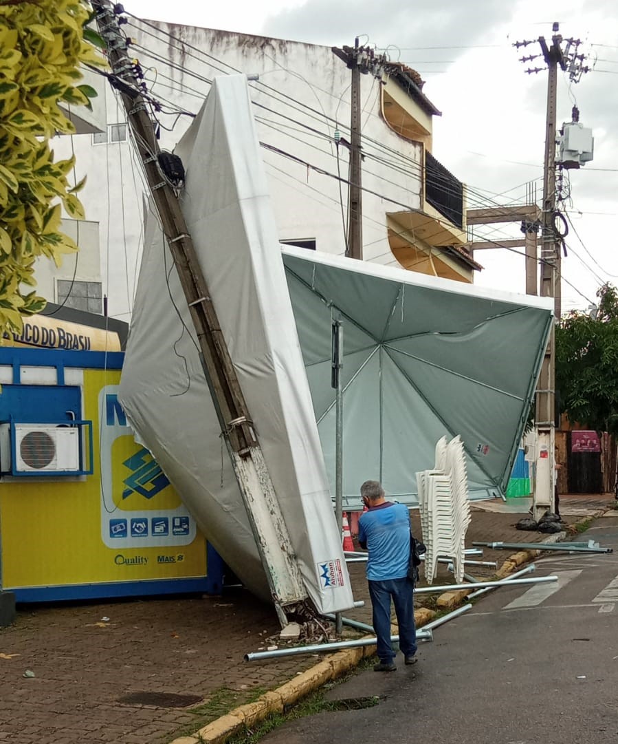 O poste situado em frente ao Banco do Brasil foi danificado pela estrutura metálica de uma das tendas e ficou inclinado.