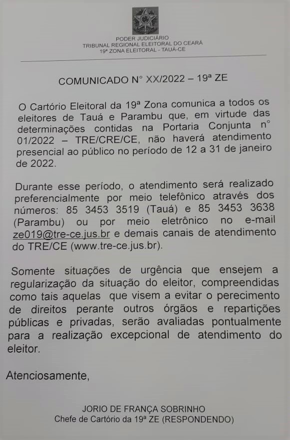 A Justiça Eleitoral da 19ª zona sediada em Tauá suspendeu o atendimento presencial no período de 12 a 31 de janeiro, no Fórum Dr. Aroldo Mota. A medida foi determinada pelo Tribunal Regional Eleitoral do Ceará em razão do aumento no número de casos de Covid-19 e de ocorrências por síndrome respiratória aguda grave e vale para todo o Estado.