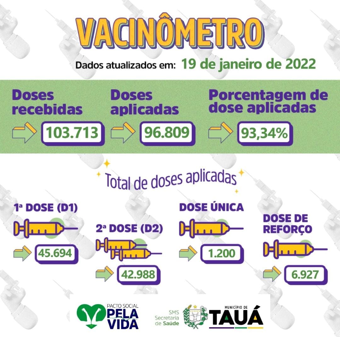 O município de Tauá atualizou hoje(19), o andamento da campanha de vacinação contra a Covid-19, iniciada há cerca de um ano. Mais de 93% das vacinas recebidas estão nos braços da população a partir dos 12 anos de idade.