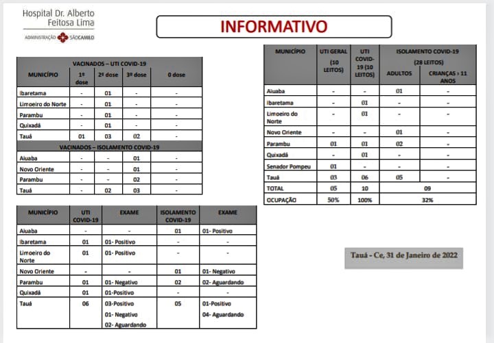 Dos 10 leitos, 06 são ocupados por pacientes de Tauá. Já a Enfermaria-Covid apresentou redução do número de internados comparado ao boletim anterior e apresenta uma taxa de ocupação de 32%, com 9 pessoas internadas, sendo 5 de Tauá.