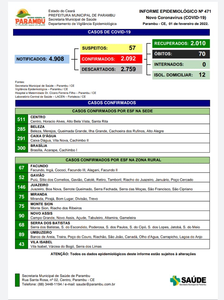 Desde o início da pandemia, 70 pessoas morreram vítimas da Covid no município de Parambu, segundo o Boletim Epidemiológico divulgado pela Secretaria de Saúde.